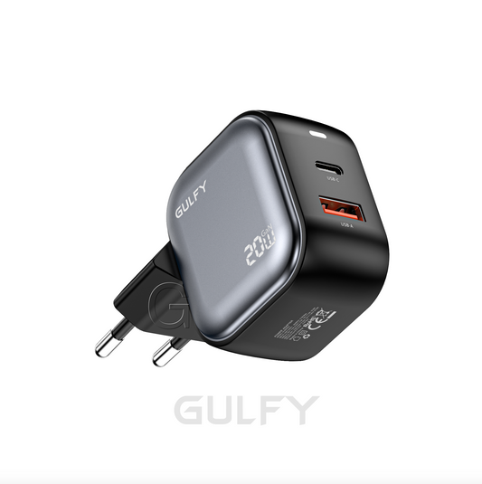 GULFY 20W USB-A & USB-C EU Plug Charger| PD20+QC3.0 Fast Charging (Black)
