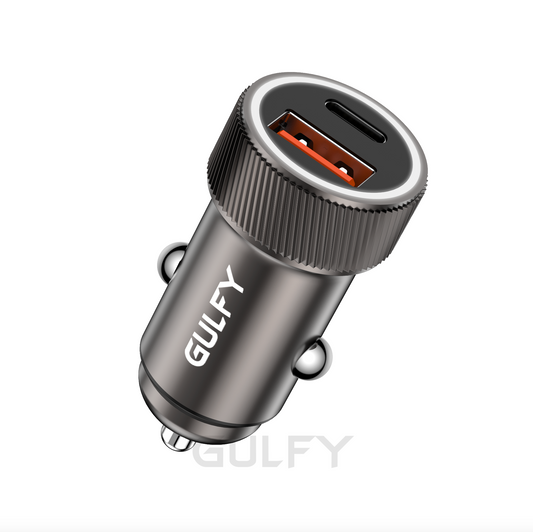 GULFY USB-A & USB-C Car Charger (30W, Brown, with Lightning cable)